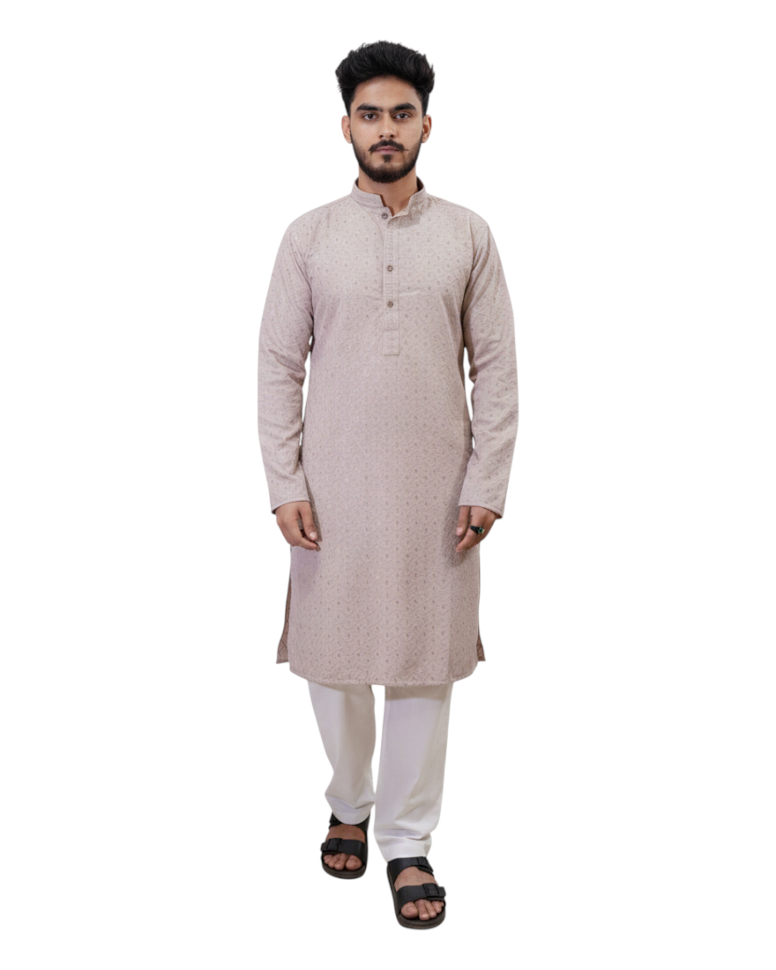 Step into timeless elegance with this beige Chikankari kurta for men by Murih — crafted for comfort, style, and tradition with pant-cut cotton pyjama (white)