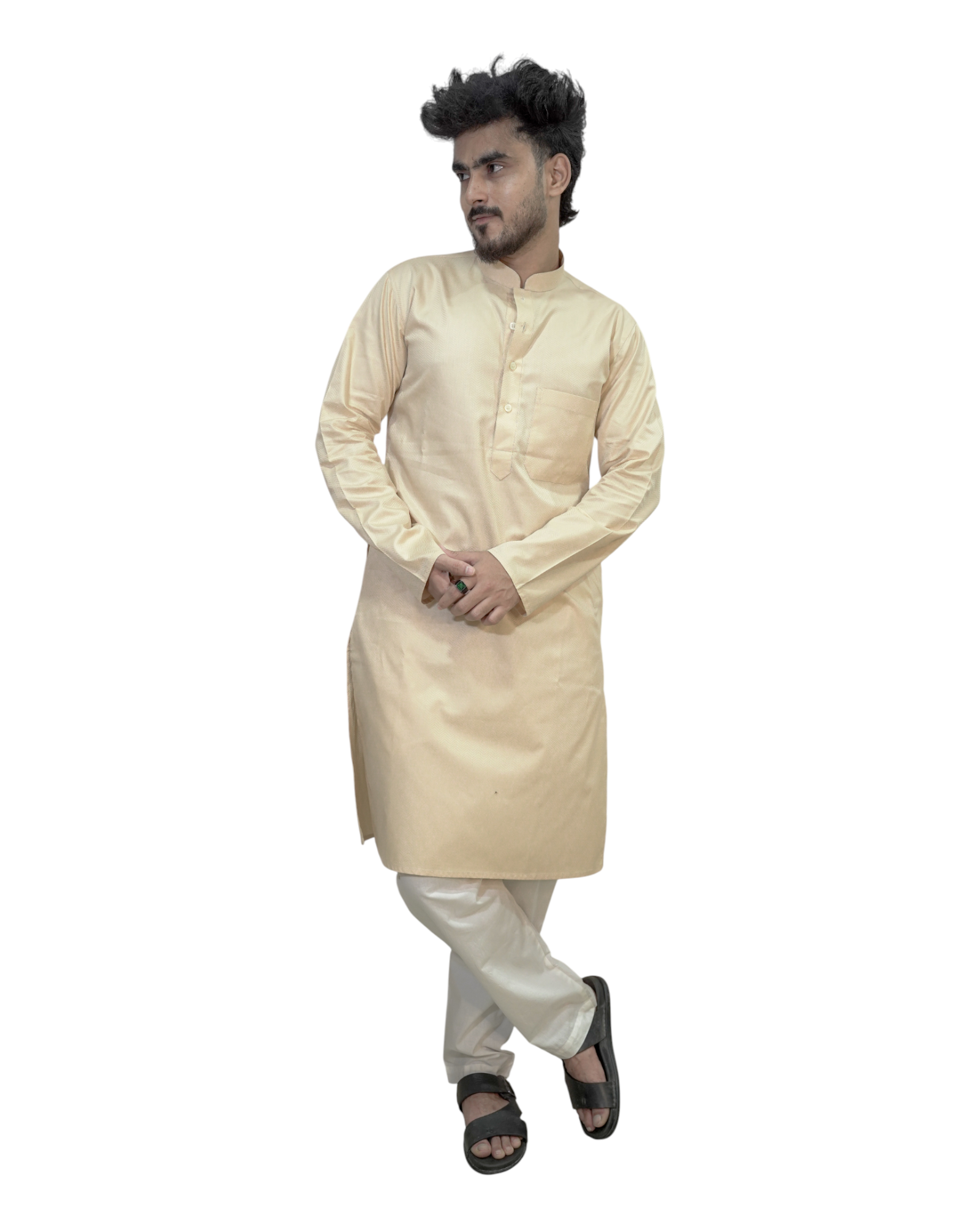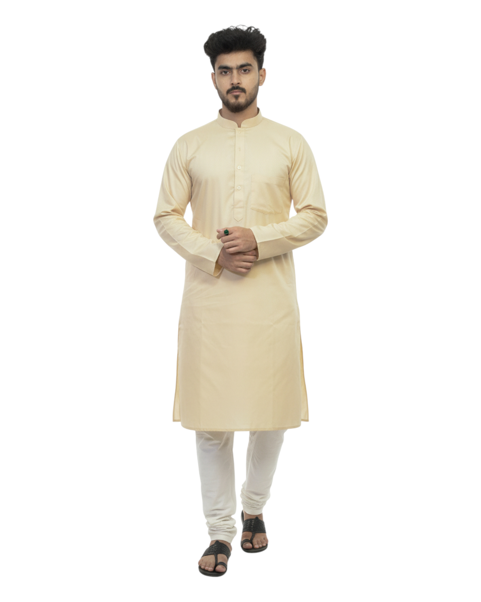 Made from lightweight breathable cotton fabric, this kurta features a soft cream-yellow tone with a smooth finish. The mandarin collar, button placket, and regular comfort fit make it a versatile choice for weddings, pujas, family gatherings, or semi-formal events.
