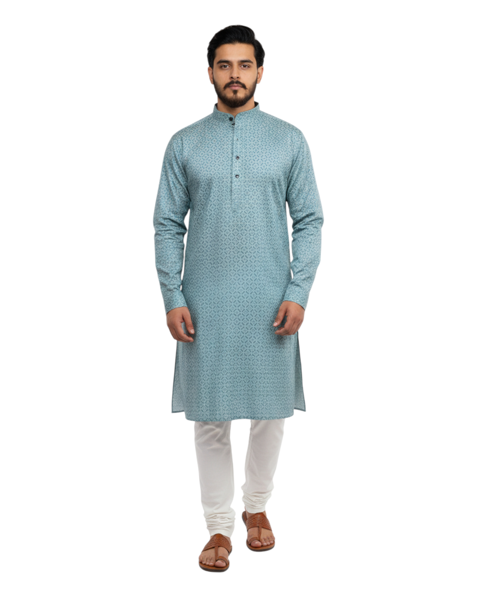 Add a refreshing touch to your ethnic wardrobe with this light blue cotton printed kurta for men by Murih — lightweight, stylish, and versatile with pant-cut cotton pyjama (white)