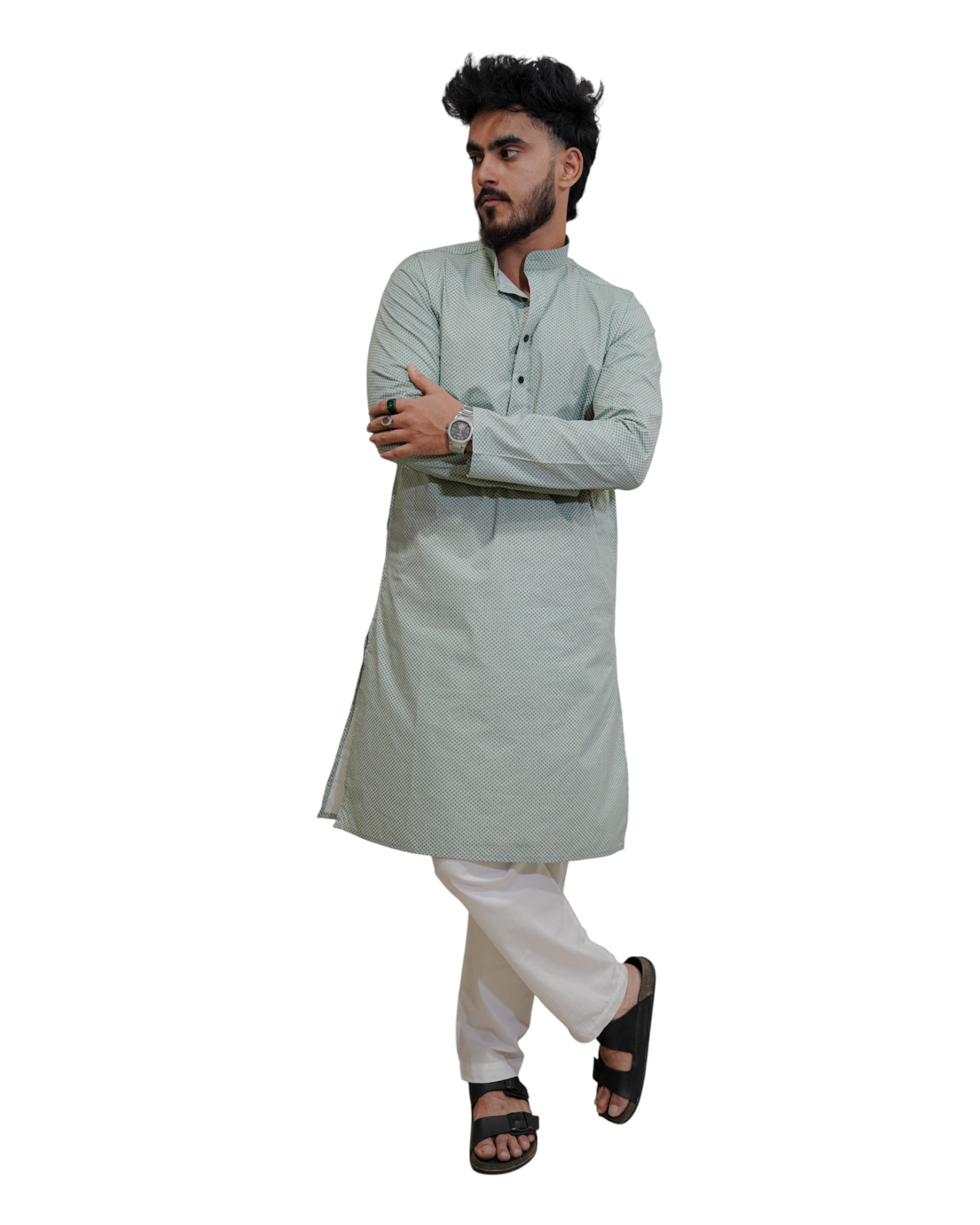 Bring freshness to your wardrobe with this mint green cotton printed kurta for men by Murih — perfect for casual, festive, and semi-formal occasions with pant-cut cotton pyjama (white)